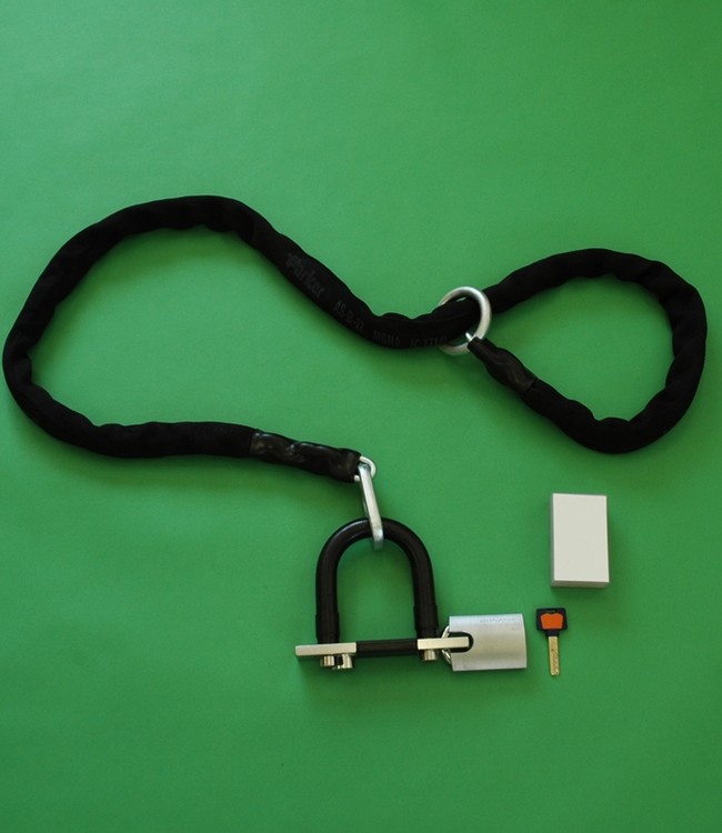 数々の工夫を凝らした盗難防止チェーンです。中空で手動の道具を使った切断はまず無理です。