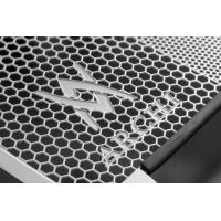 フロントタイヤの真後に当たるセンター部は走行中に巻き上げられた小石やゴミから確実にコアをガードする細かいメッシュ、また両サイドは通風性を考慮した粗いメッシュを配置し、コアガードとして求められる保護と冷却性能を両立。