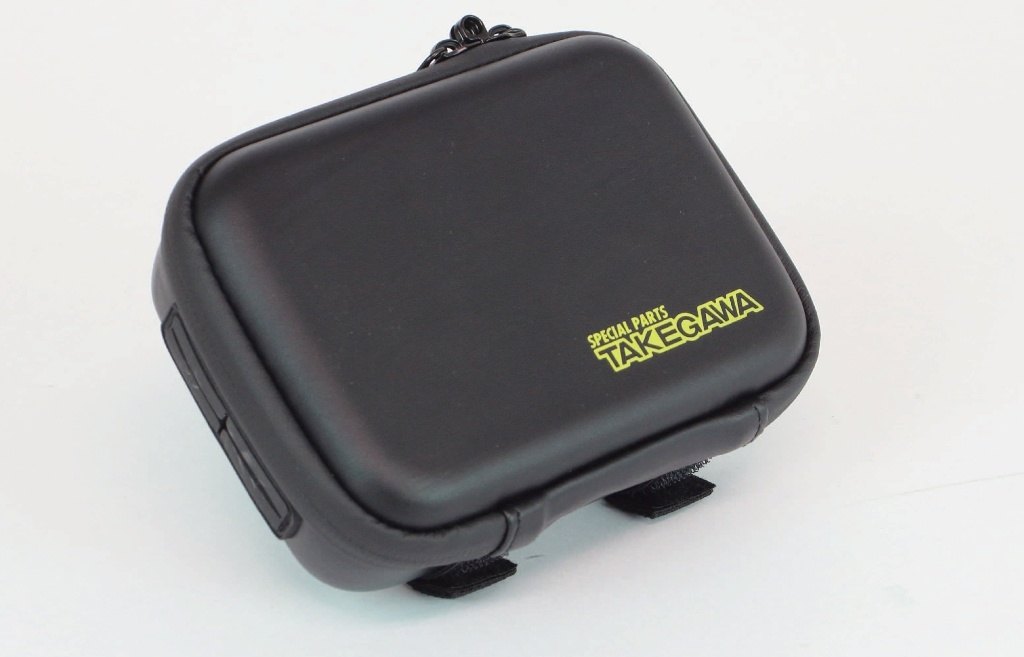 固定方法は、ケース背面に設けられた面ファスナー式固定ベルトを使用し、車両のフレーム各所やハンドルブレース等に固定します。