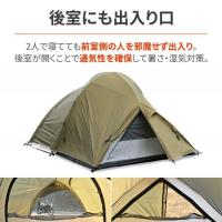 2人で使用してもゆったり過ごせる前室に、ダブルベッドよりも広い室内を用意した2人用テント。