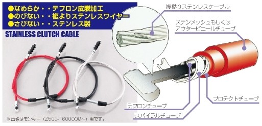 キタコが自信を持ってお奨めするステンレスケーブルはインナーケーブル高密度の複撚り(7×7=49本)に仕上げ、高張力加工、表面特殊加工を施した為、表面の凹凸が少なく、テフロンチューブ内蔵により、摩擦を減少させ、非常に滑らかなスラッチ、スロットルワークを実現しています。