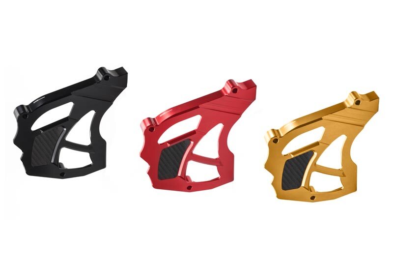 Sprocket cover CNC machined from light alloy billet and then given an anodized surface finish.
