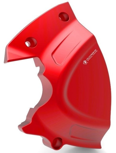 今までのアルミ製スプロケットカバーは平面的なデザインがほとんどでしたが、イタリアメーカーならではの曲線美を見事に生かした次世代アルミ削り出しスプロケットカバーです。
