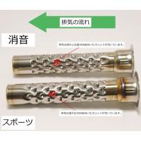 スポーツ:消音タイプ同様にサイレンサー側面に排出しますが、反転させず、排気の流れに沿った排出をする為、結果排気効率のロスが少ない中でも、サイレンサーパンチング・ウールの消音機能を発揮させるタイプです。