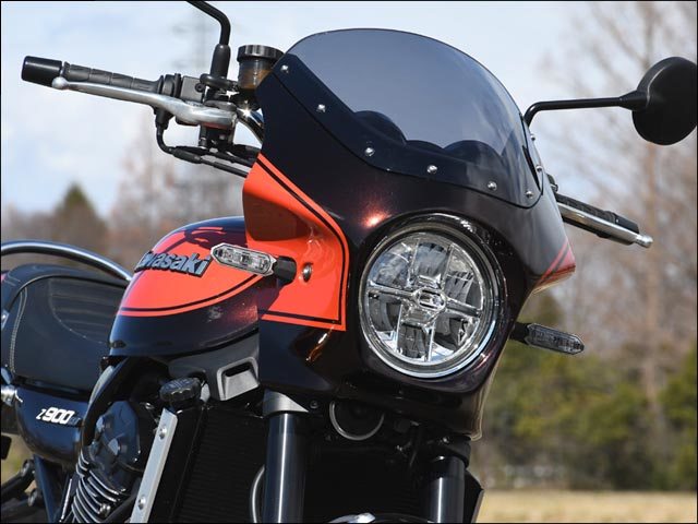 カワサキらしい直線的な面構成を、Z900RSのラウンドしたスタリングに落とし込んだ造形の専用ビキニカウル。