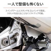 L型アタッチメントに装着されているゴムバンドをスイングアームに巻くことでリアスタンドをスイングアームに固定。