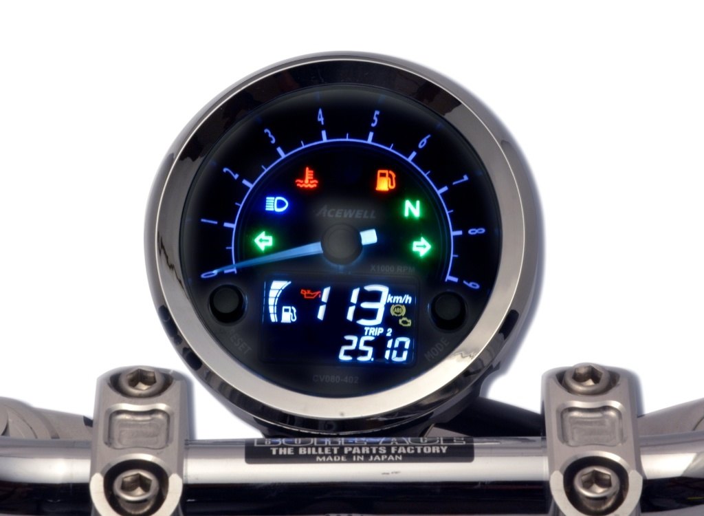 80mm針式のタコメーターまたはスピードメーターにデジタル機能を統合し、7つのLEDおよび6つのLCDインジケータを搭載。