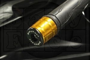 軽量なアルミ合金に各アルマイト 又は、振動対策用に重量のあるステンレス(SUS)を使用し、 Φ22mmショート、Φ30mmベリーショート、ショート、ロング、さらに先端にジュラコンをはめ込んだ大径Φ35mmロングの各種・各色を揃えています。