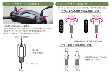 一般的な8ミリと10ミリのミラー基部にお取り付けできます。