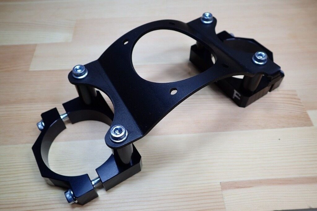 応力が集中しないように出来るだけ長いボルトを使用し、ブラケットとボルトが曲がって、フォークに食い込んだりしないように、軽く締めても剛性が出る構造にしてあります。