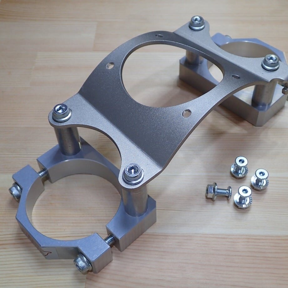 応力が集中しないように出来るだけ長いボルトを使用し、ブラケットとボルトが曲がって、フォークに食い込んだりしないように、軽く締めても剛性が出る構造にしてあります。