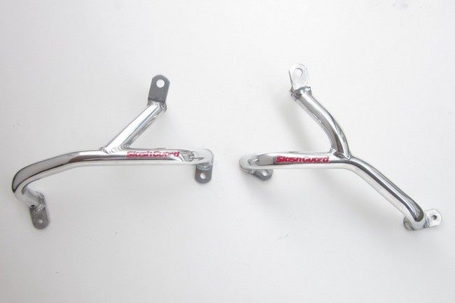 スラッシュガードは、材質がアルミ52Sを使用し軽量、強度面は、クランクケースとの間に5mmから10mmの衝撃吸収ゴムをはさみ、しっかり衝撃を吸収。