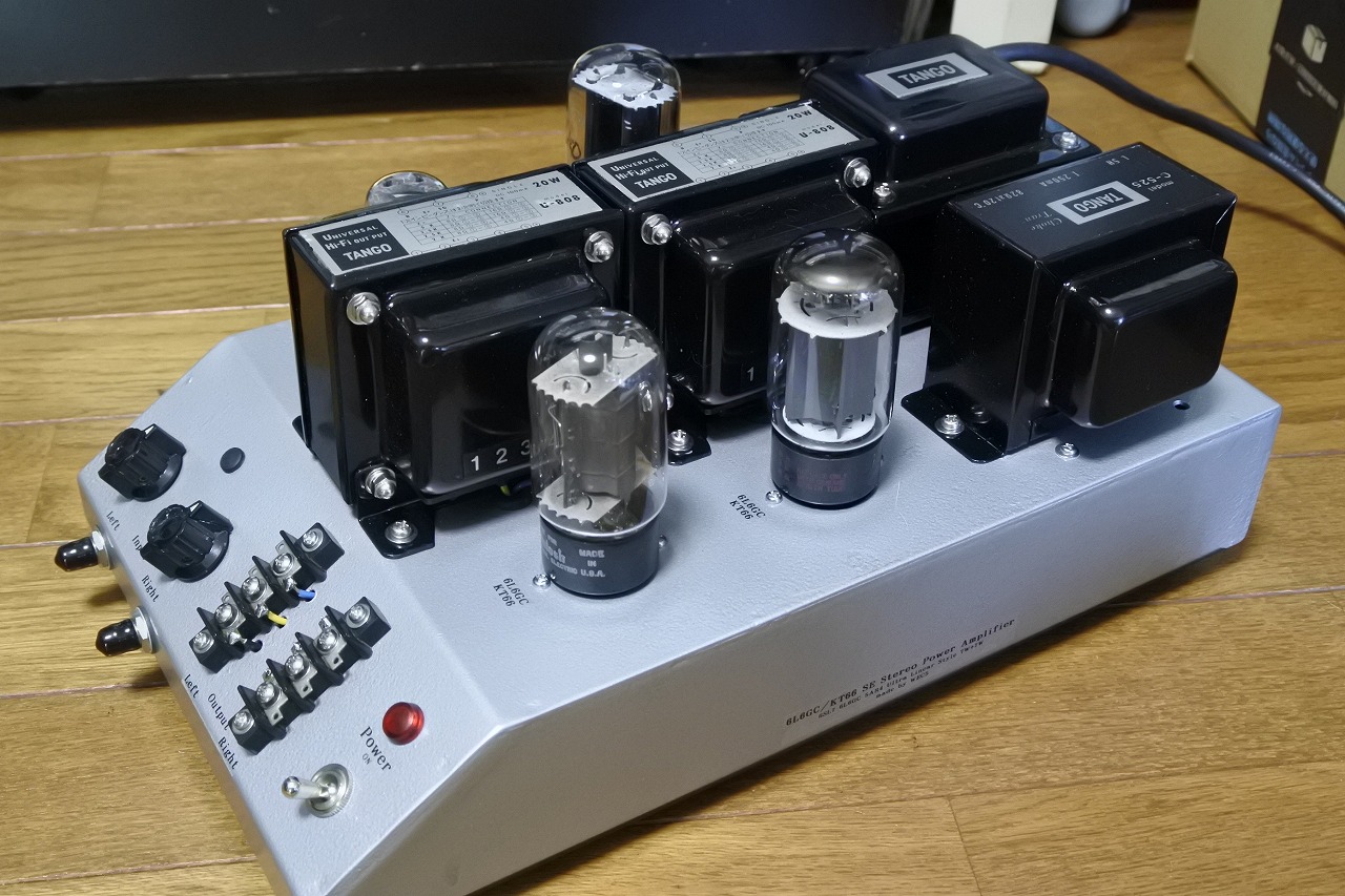 特注6L6GCシングル三極間接続ステレオパワーアンプ。最大出力2W+2W。(UL接続変更可能。その場合は6W+6W。)周波数特性30Hz〜15KHz -1dB。残留ノイズ0.6mV/8Ω。使用球は1x6SL7、2x6L6GC、1x5U4GB。6L6GCの代わりにKT66も使用可能。