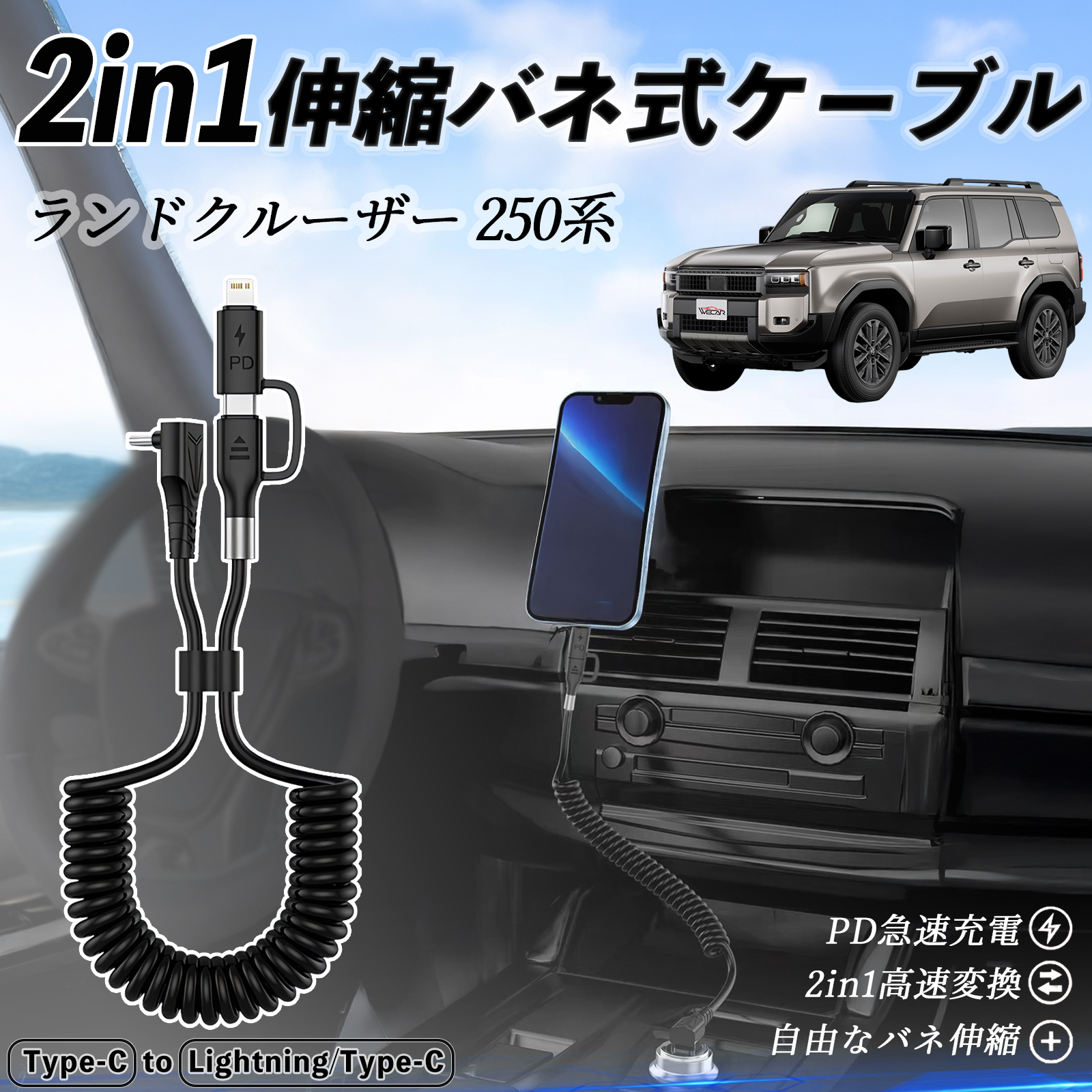 トヨタ ランドクルーザー 250系 2in1 USB-C ライトニングケーブル カールコード MFi認証 充電ケーブル PD 27W/60W 急速充電 WeCar