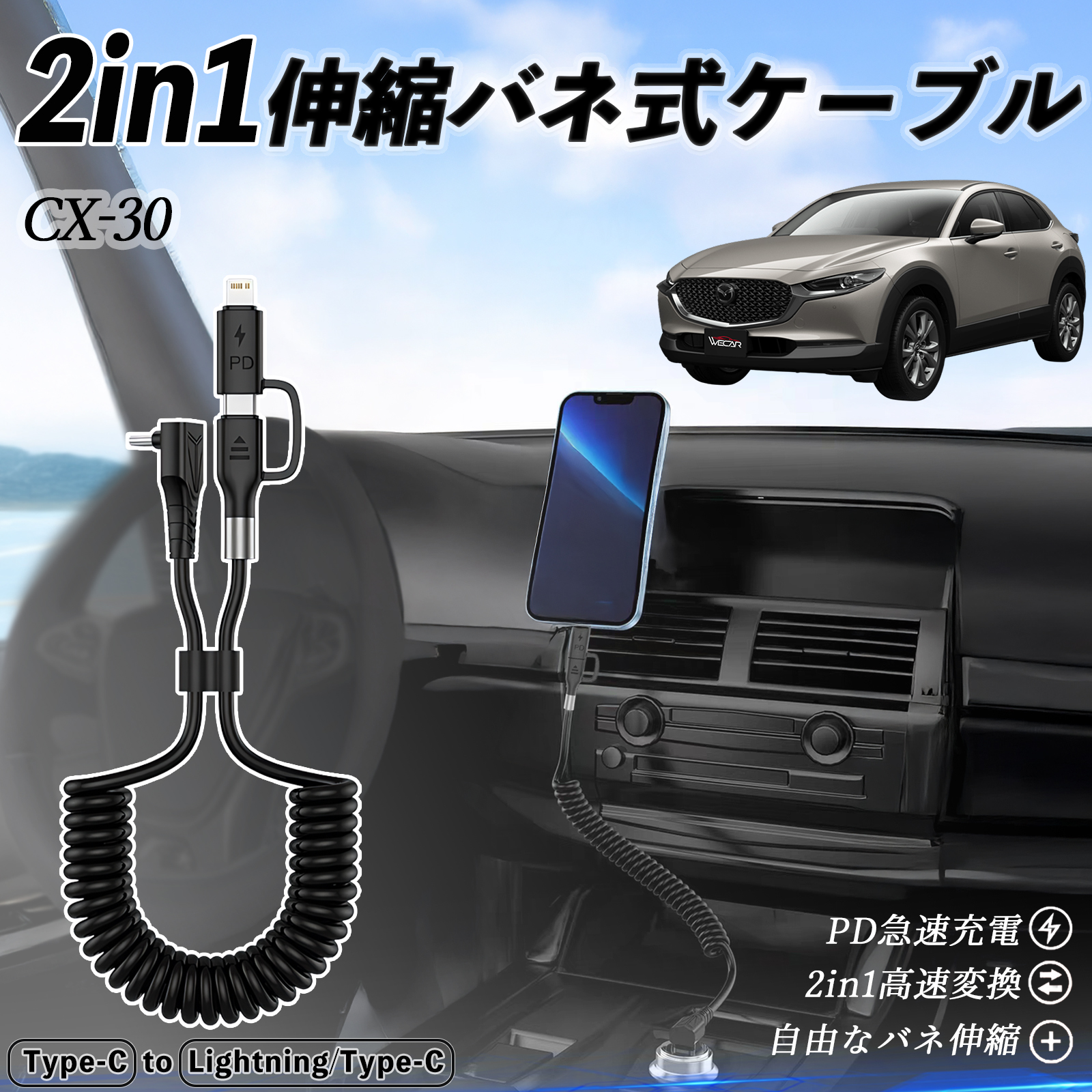 マツダ CX-30 2in1 USB-C ライトニングケーブル カールコード MFi認証 充電ケーブル PD 27W/60W 急速充電 WeCar