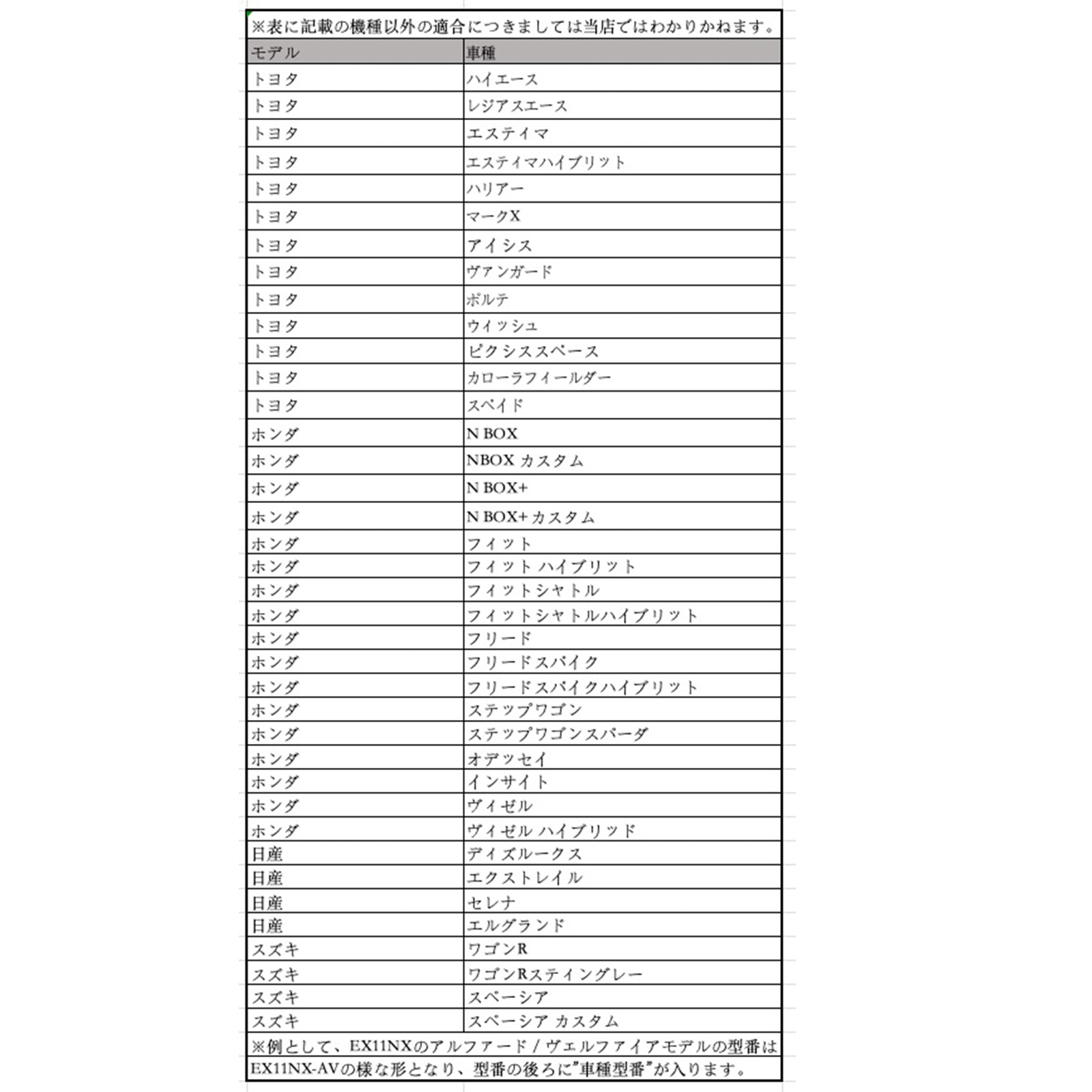 ※例として、EX11NXのアルファード/ヴェルファイアモデルの型番は