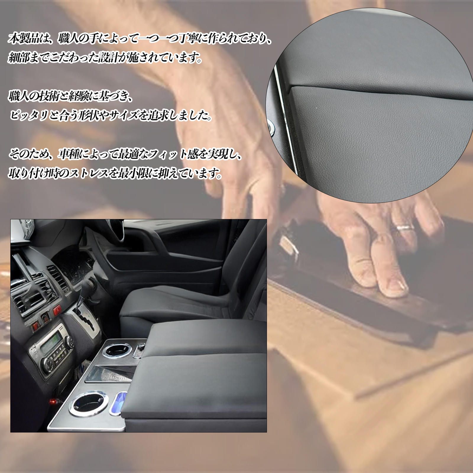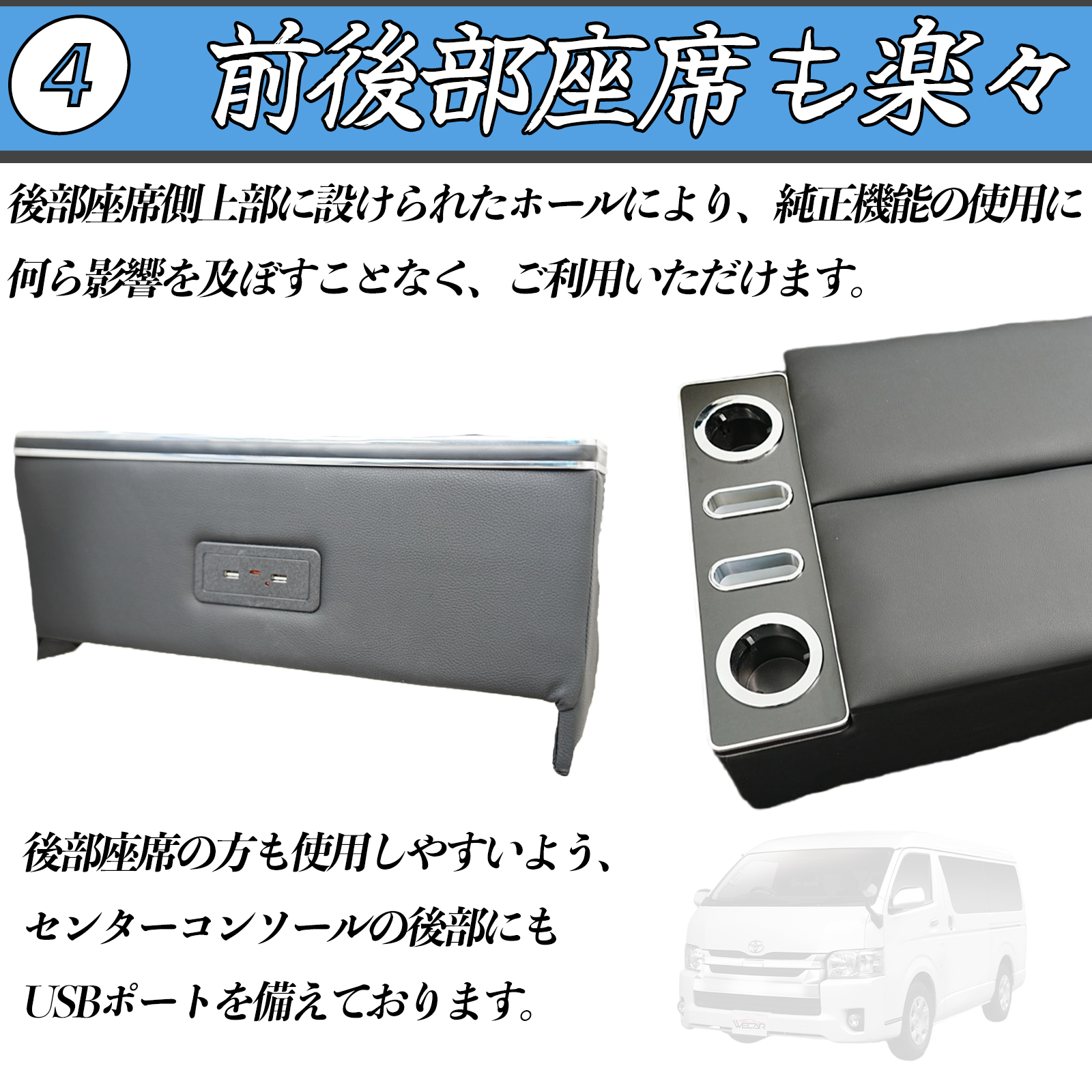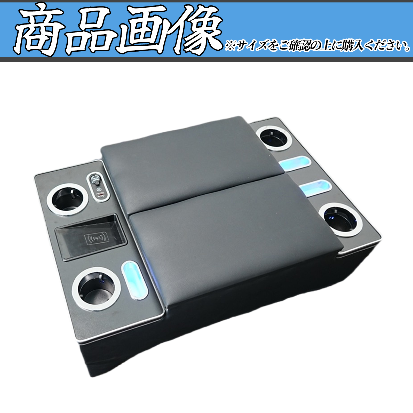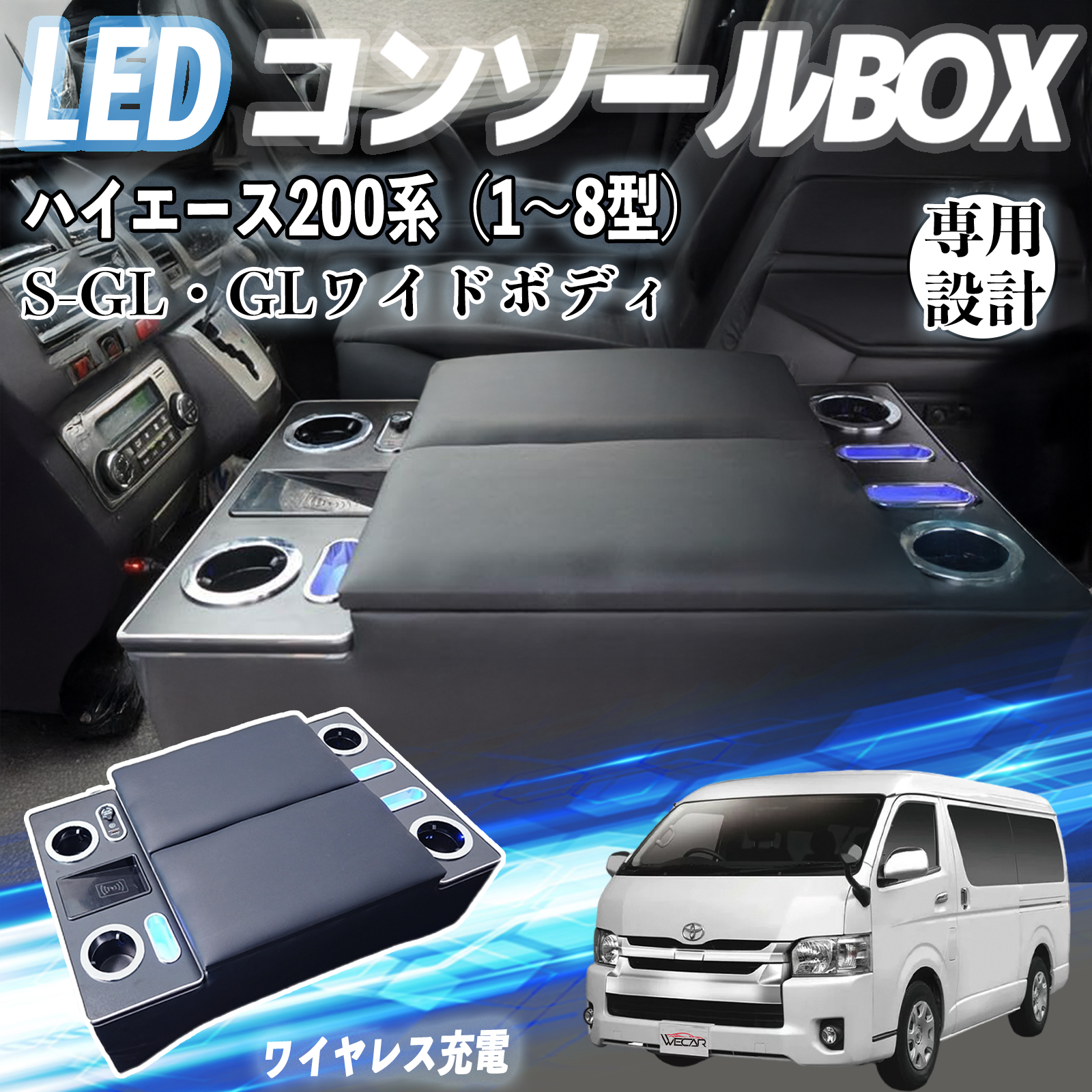 | 商品名 | トヨタ ハイエース 200系 専用 コンソールボックス LEDイルミネーション付き / ワイドボディ対応 1〜8型対応 USBポート搭載 アームレスト収納 |