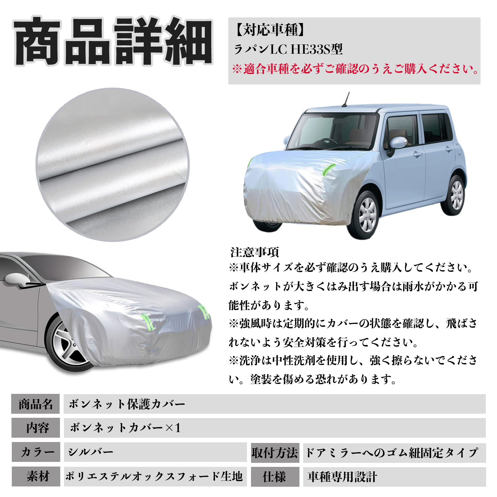 スズキ ラパンLC HE33S型 ボンネットカバー 防炎フロント保護カバー 車カバー 劣化 日焼け防止 アンチエイジング 防塵 蛍光反射 WeCar