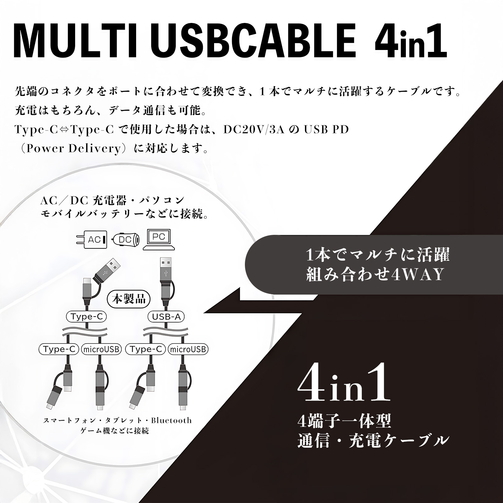 Type-C、Micro-B、USB-A対応の4端子一体型ケーブル使用可能。