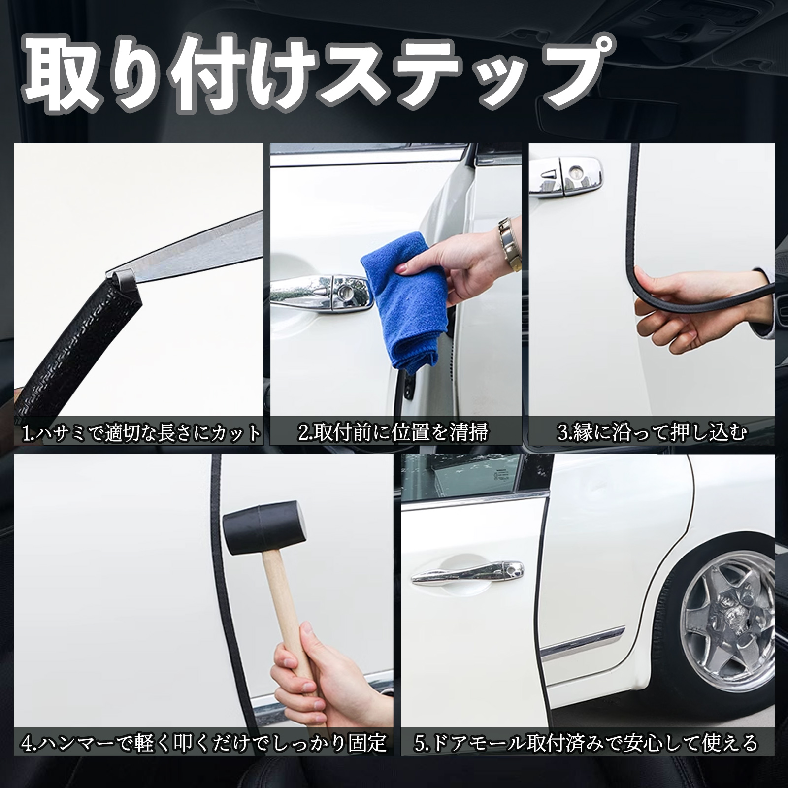 ゴムとスチール芯の二重構造でドアの縁をしっかり保護。開閉時や隣の車との接触による擦り傷を防ぎ、愛車と相手の車を守ります。