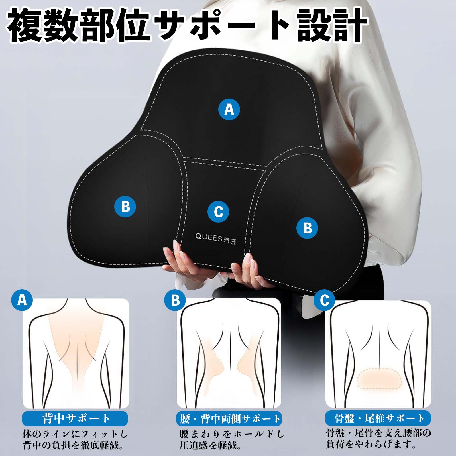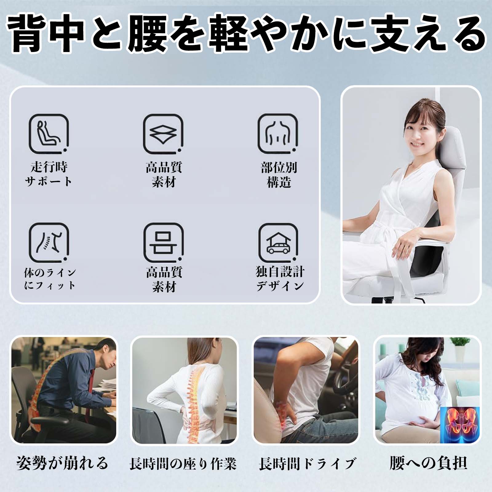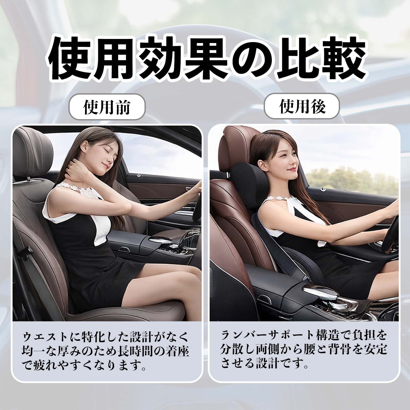 腰から首まで自然なS字ラインをサポートし、長時間の運転やデスクワーク時の姿勢を安定させます。