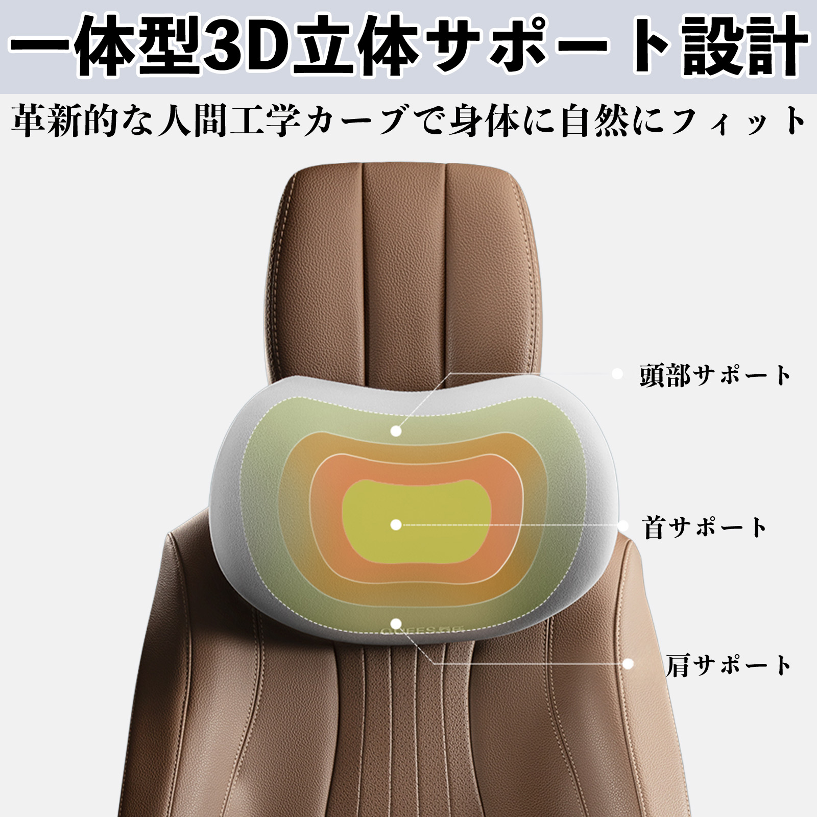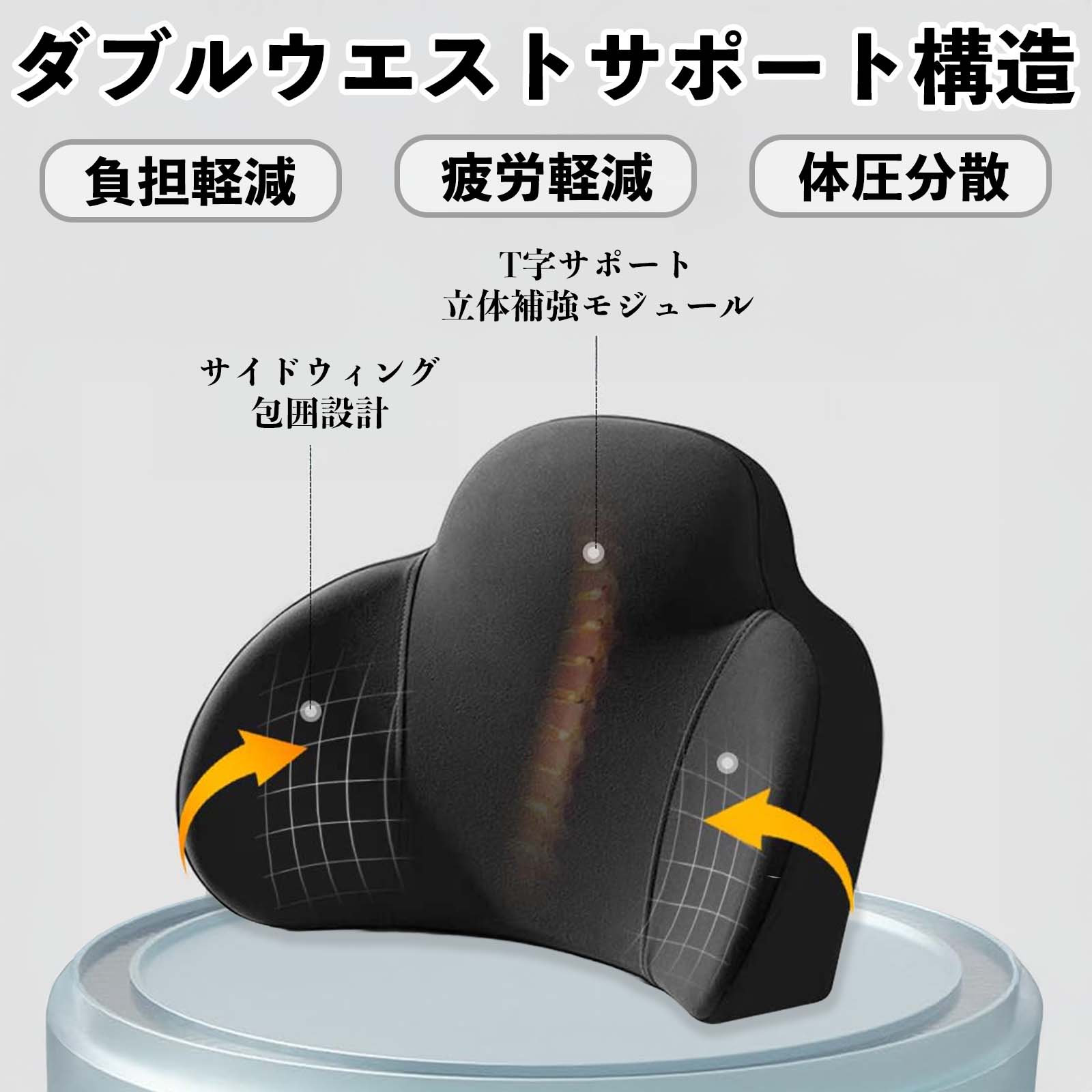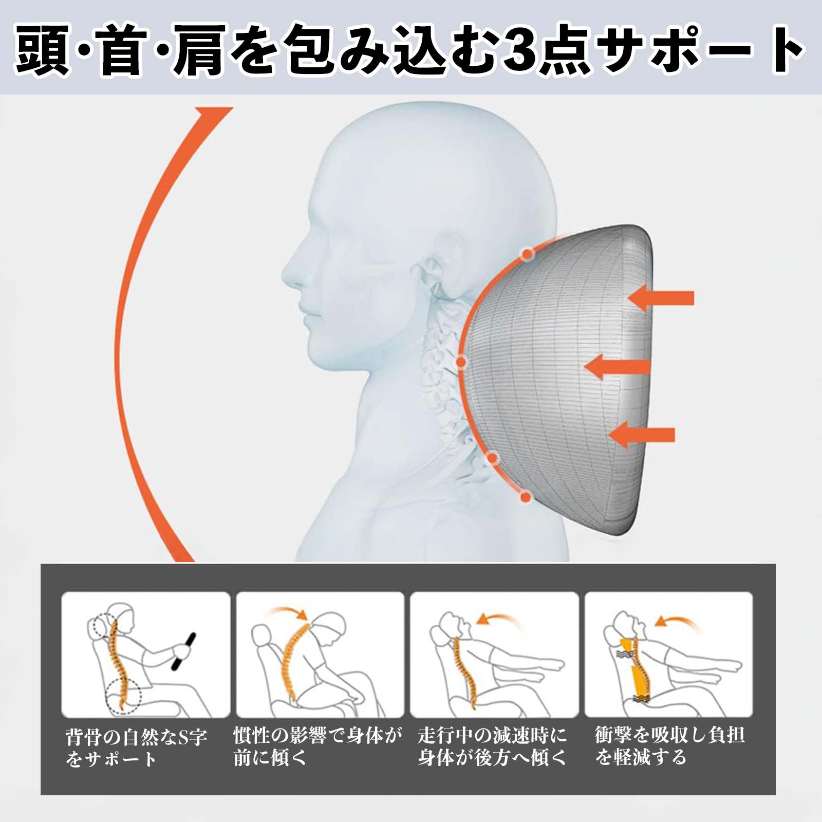 腰から首まで自然なS字ラインをサポートし、長時間の運転やデスクワーク時の姿勢を安定させます。