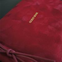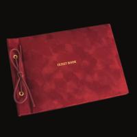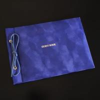 シンプルな紐とじゲストブック(芳名帳)です。ちょっと起毛した肌触りのよいベロア生地を使用し、高級感を出しました。表紙にはゴールドで[Guest book]と箔押しされています。紐を緩めれば中紙を取り外してお使いいただくこともでき、別売りのリフィルを付け足すことも出来ます。1ページ5行で、横書きです。罫線のみのシンプルなタイプですので、お名前のみ記入の場合にもお使いいただけます。