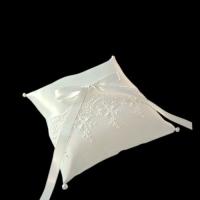 人気の高い小さめリングピローに繊細なレースをのせ ました。中央に結んだリボンでリングをキープします。 (1つのリボンで2つのリングをキープします) コーナーに付けたパールが全体を引き締めます。