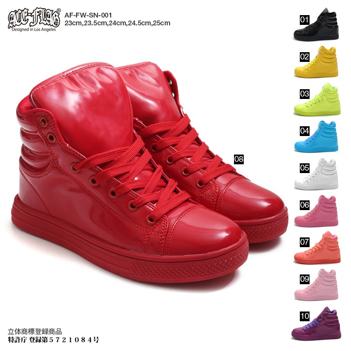 全国のダンスチームからご注文殺到中♪ありそうでなかった超シンプルなエナメル超ツヤ加工ハイカットスニーカー!!アウトソールや紐まで同色で統一されたワンカラーは、ダンスチーム衣装としても人気です!嬉しい10色展開!