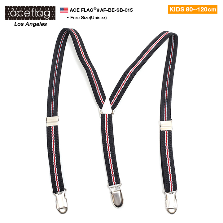 国内の有名アーティスト、ファッショニスタが着用し話題のLA発ストリート系ブランド「ACEFLAG/エースフラッグ」からオシャレなベビー からキッズサイズ対応のサスペンダーが入荷。素材は年中使えるゴム素材。動きに合わせて伸縮する伸びる素材。対応身長の目安は80cmのベビーから120cmのキッズまで(1歳から5歳くらいまで)。金具を開くだけでカンタンにサイズ調整できるフリーアジャスター付き。先端はパンツやスカートにしっかり留まる3つ山のクリップ仕様。デザインは英国調の品があるトリコロールカラーの配色とボーダー柄を採用。形は前身がH型、背中がY型になるスタイリッシュなワンポイントデザイン。サイズが合わなくなってしまったボトムなどを留めて使ったり、パンツに付けてたらしたり、スタイルやシーンに合わせてアレンジも自由自在。普段使いは勿論、コスプレやダンス衣装・体育祭・運動会・アウトドアなどのスポーツにもオススメ。