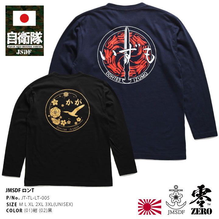 『護衛艦いずもとかがの公式ロゴマーク』後ろ身に、特大版で(01)いずも(紺×白赤)と(02)かが(黒×金)の公式ロゴマークを忠実に再現した長袖Tシャツが登場!