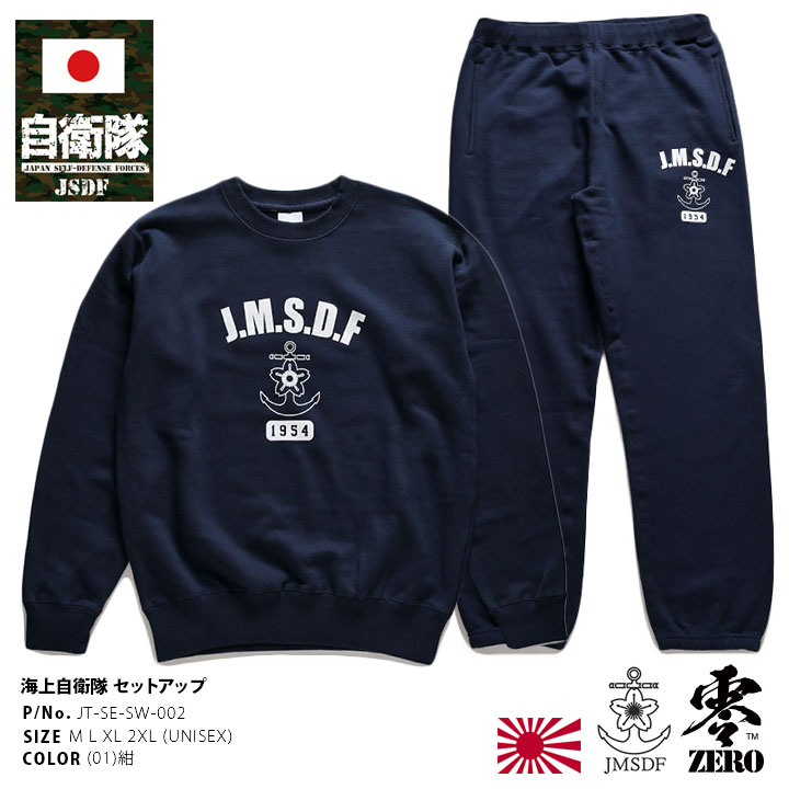 『オシャレなデザイン』海上自衛隊を表す英字略称「JMSDF」のアーチロゴとシンボルマーク、創設年度を上下にワンポイントでレイアウトしたトレーナーとスウェットパンツのセットアップ。