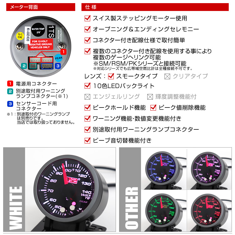 AUTOGAUGE オートゲージ 水温計 52mm スモークレンズ 10色バックライト 後付けメーター 追加メーター ワーニング ピーク機能 自動車 カスタム WEIMALL