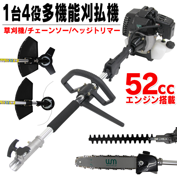 多機能 草刈り機 刈払機 チェーンソー ヘッジトリマー エンジン式 52cc 剪定 高枝切り 薪割 バリカン ナイロンカッター 金属刃 草刈機 1台4役 ハイパワー