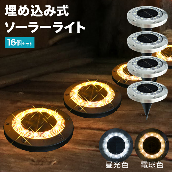ソーラーライト 屋外 LED ガーデンライト 庭 16個セット 埋め込み 置き型 自動点灯 防水 駐車場 地面 外灯 誘導灯 ガーデニング ソーラー 昼光色 電球色