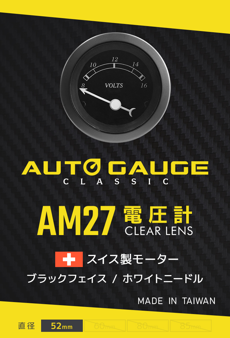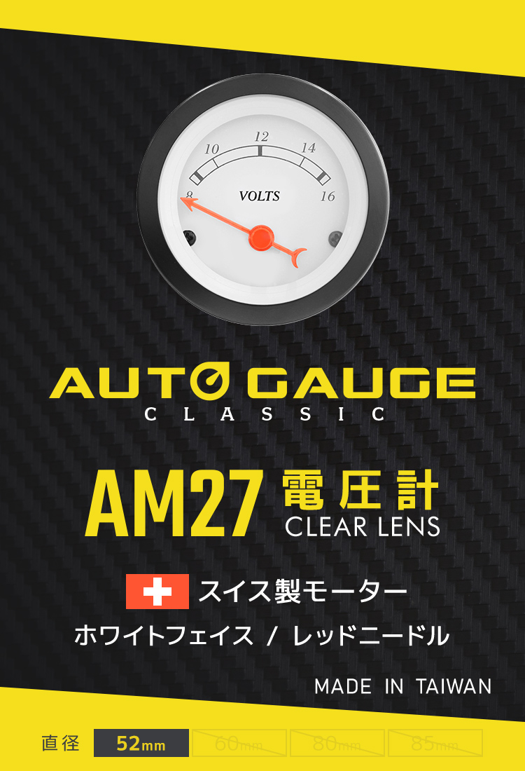 AUTO GAUGE(オートゲージ)AMシリーズの52mm電圧計は、シンプルで視認性に優れたクラシックデザインを採用した定番モデルです。 8?16Vの電圧を正確に表示し、バッテリー状態や電装負荷の確認に最適。昼夜問わず読み取りやすい針と文字盤設計で、初めての追加メーターにも扱いやすい仕様です。 ラインナップは、明るく高コントラストな白文字盤×黒ベゼル×赤針のホワイトフェイスと、精悍で引き締まった黒文字盤×黒ベゼル×白針のブラックフェイスの2種類。 車内の雰囲気や好みに合わせて選べる、AMシリーズならではのバランスの良い電圧計です。