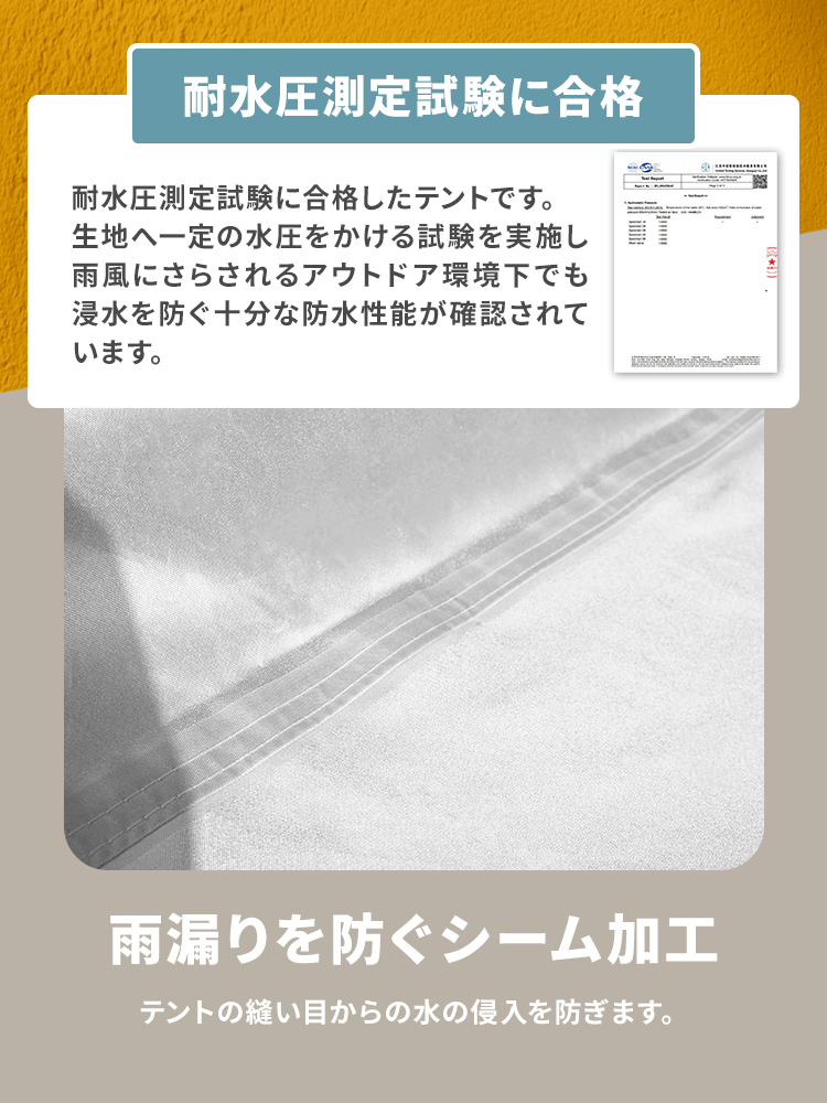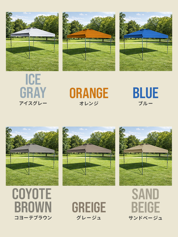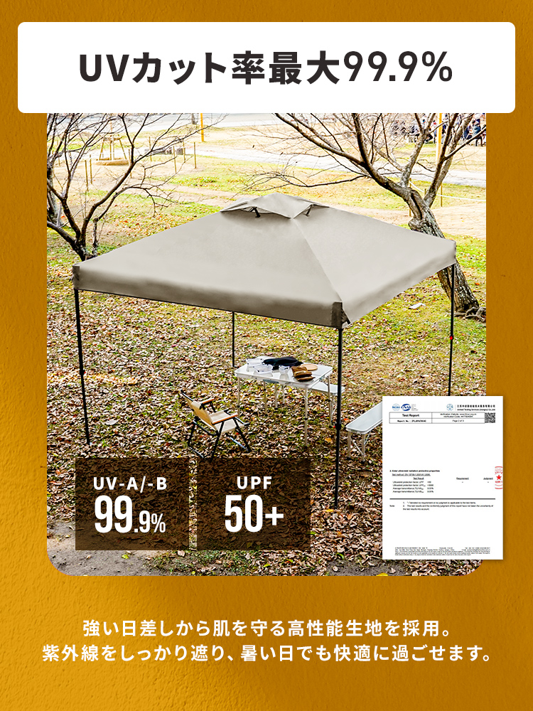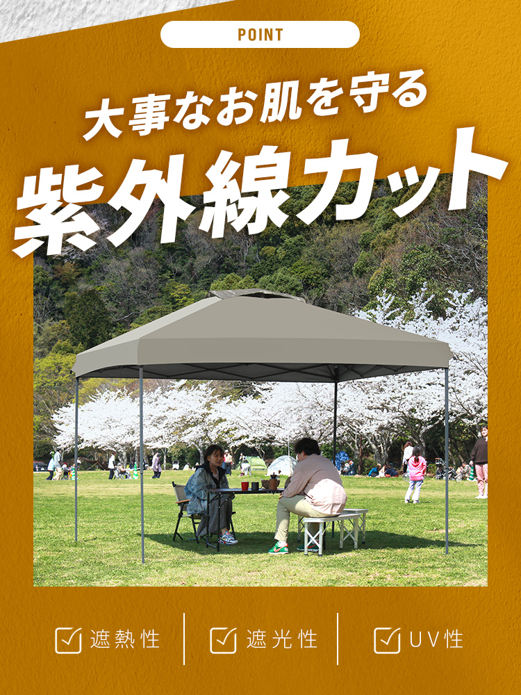 頑丈なスチールフレームと150Dオックスフォード布(シルバーコーティング)を採用し、強い日差しや熱をしっかり遮断します。