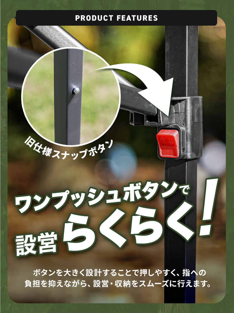 撤収時もワンタッチボタン式でスムーズに折りたたみができます。