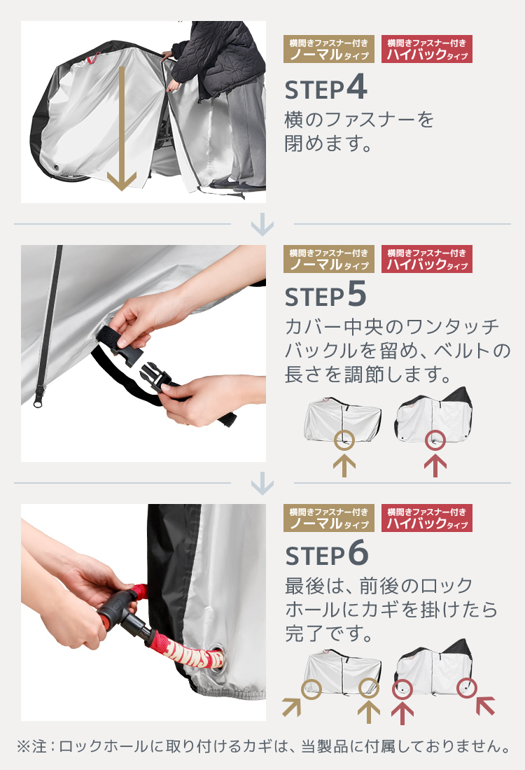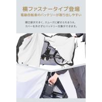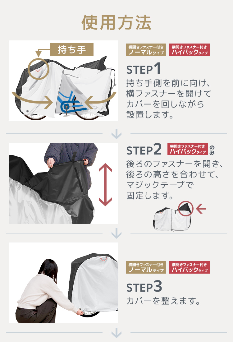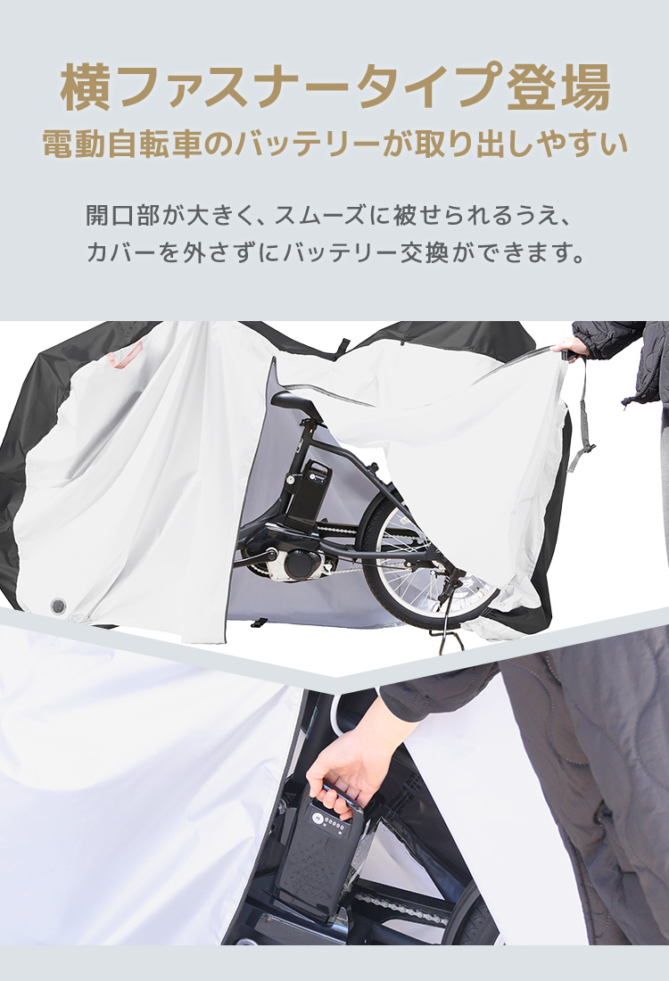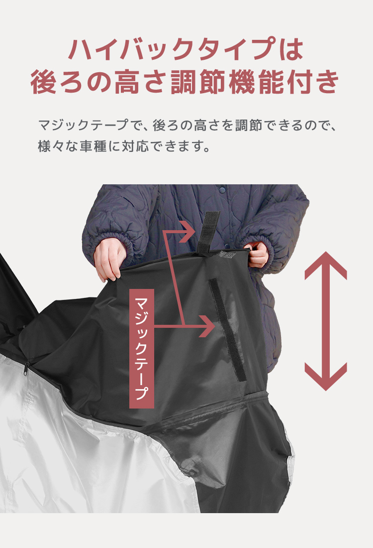 サイドファスナータイプなので子供乗せ電動自転車やハイバック自転車にもラクに着脱可能。