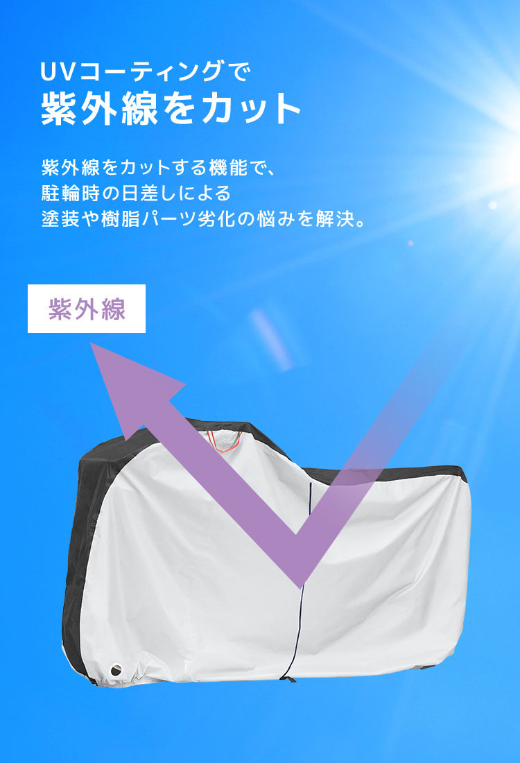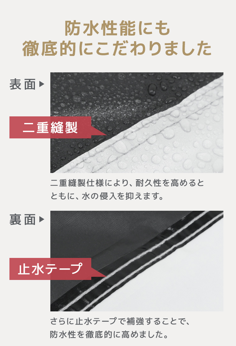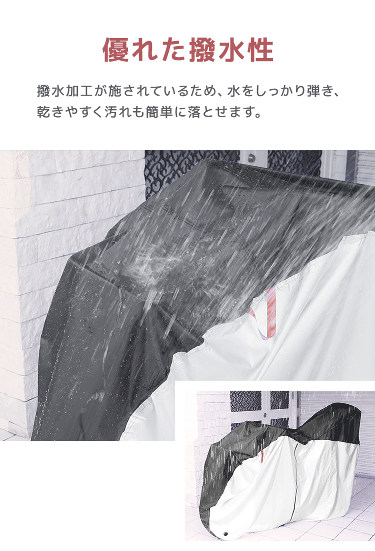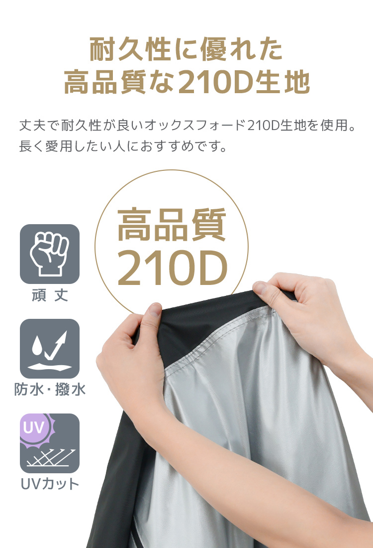オックスフォード210Dの厚手生地と二重補正+防水テープ仕様で、雨や砂埃からしっかり車体をガードします。