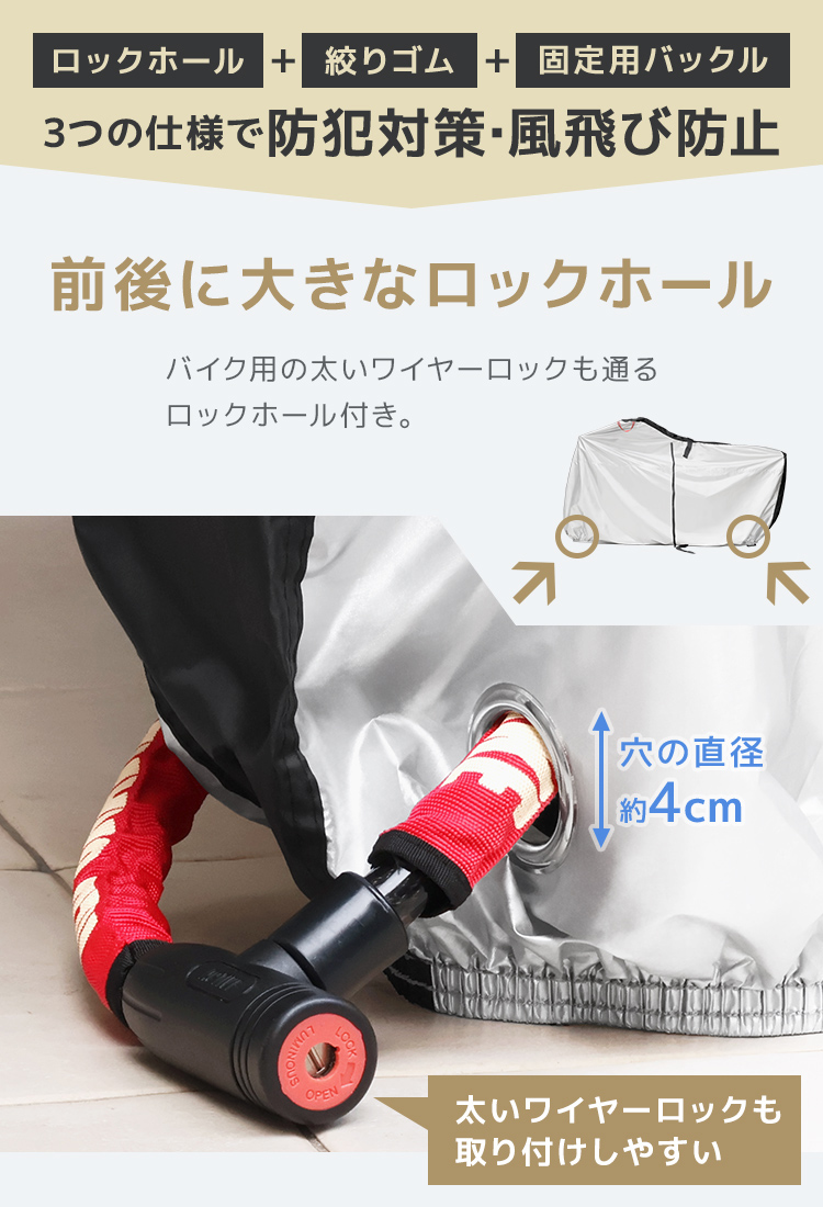 ロックホール付きでチェーンロックが通せるため防犯性が高く、風飛びも防止。