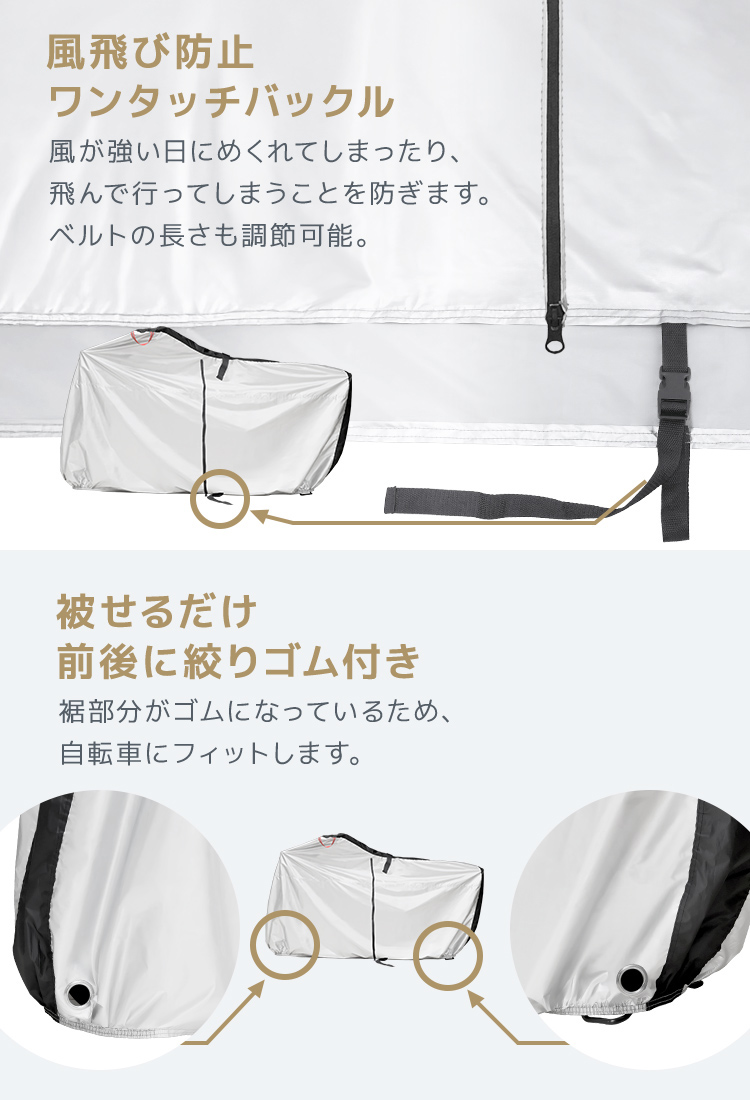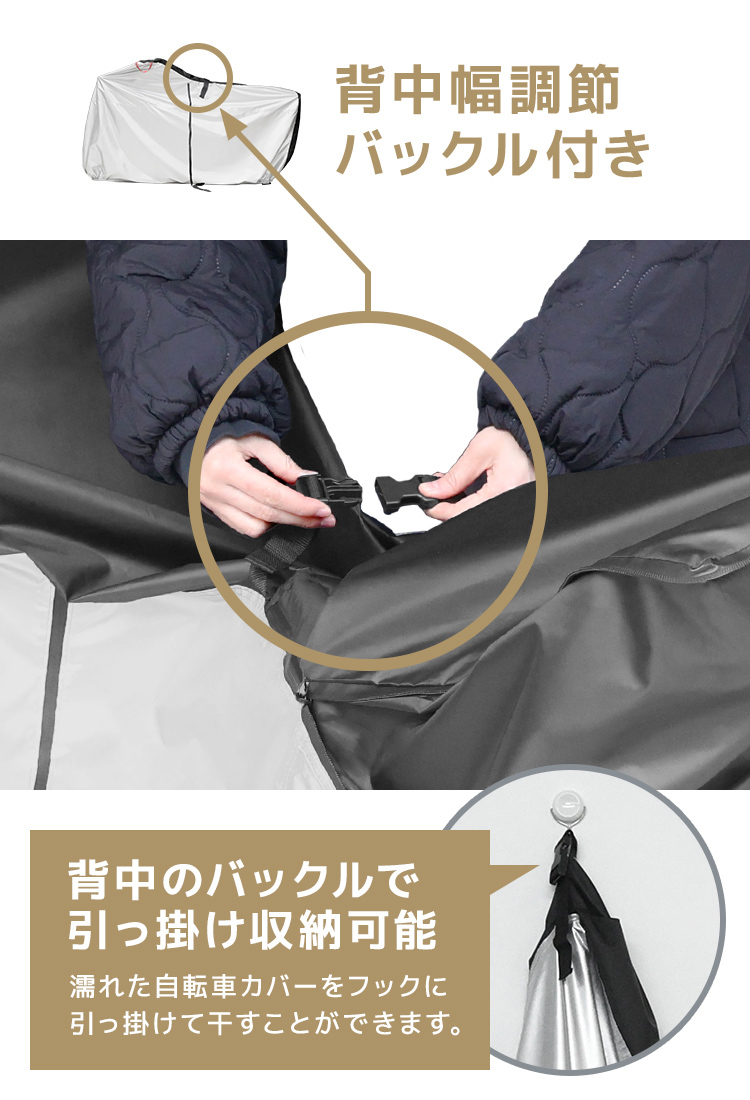 背中幅調整バックルとフックに掛けて収納できるので、スッキリ片付けられる自転車カバーです