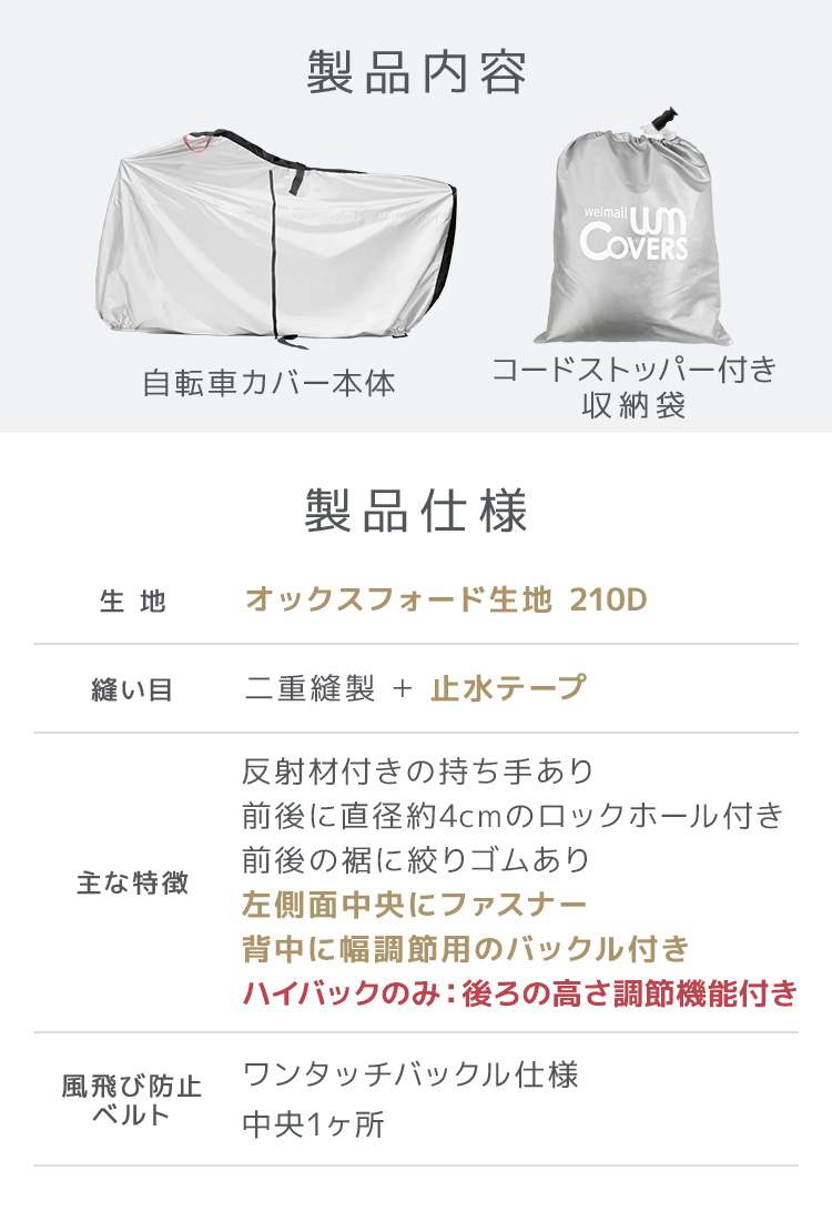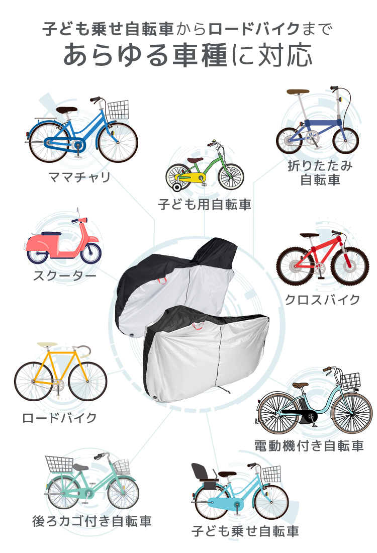 自転車カバー 防水 厚手 ハイバック 子供乗せ 子供用 大人用 サイドファスナー 飛ばない 破れにくい 横開き UVカット サイクルカバー 収納袋付き ロック穴 簡単