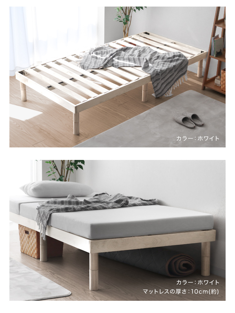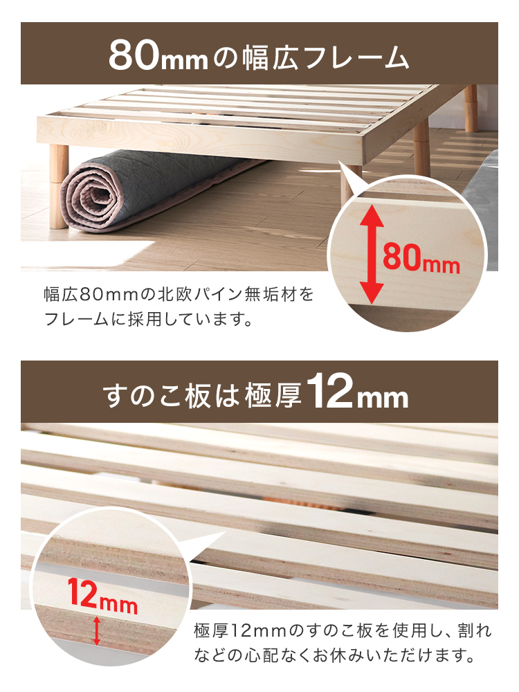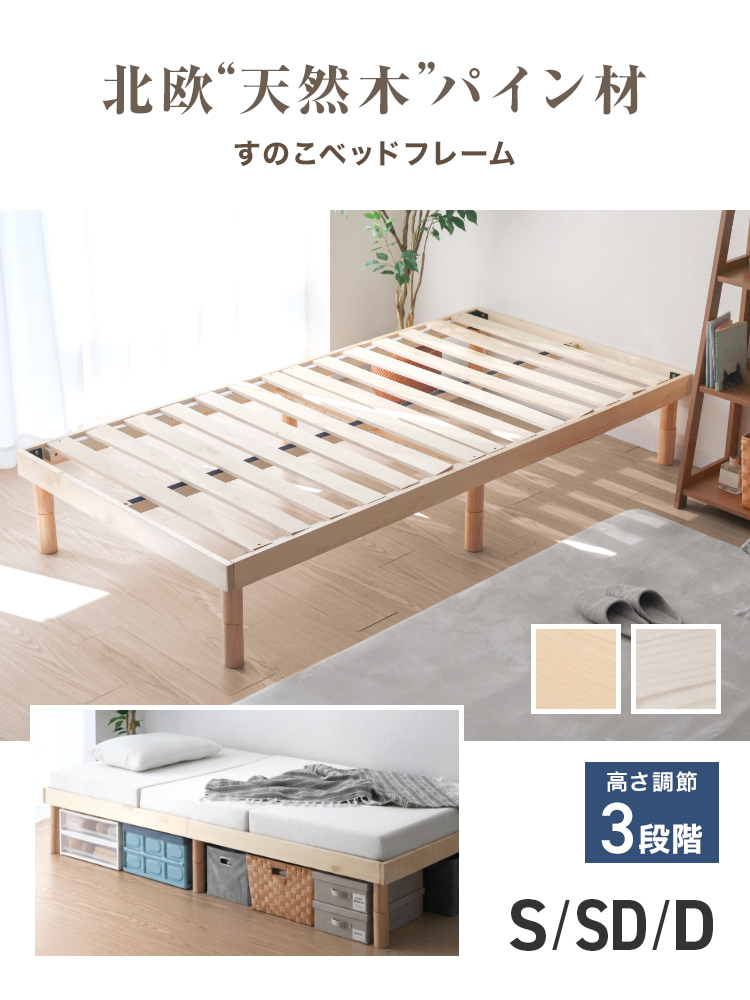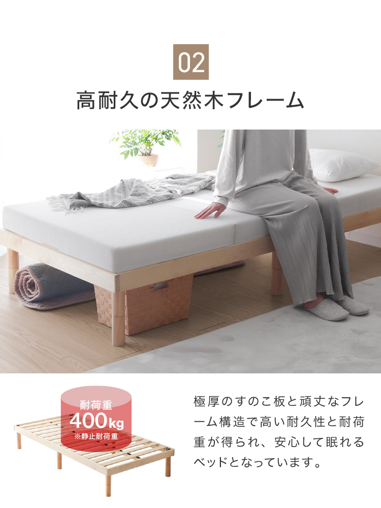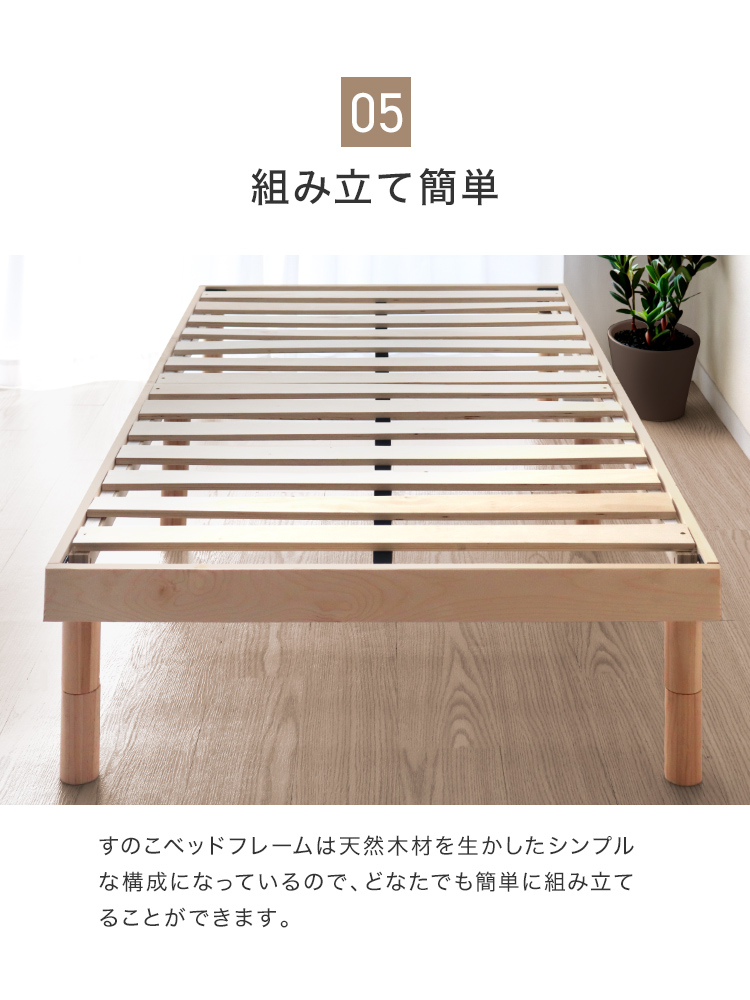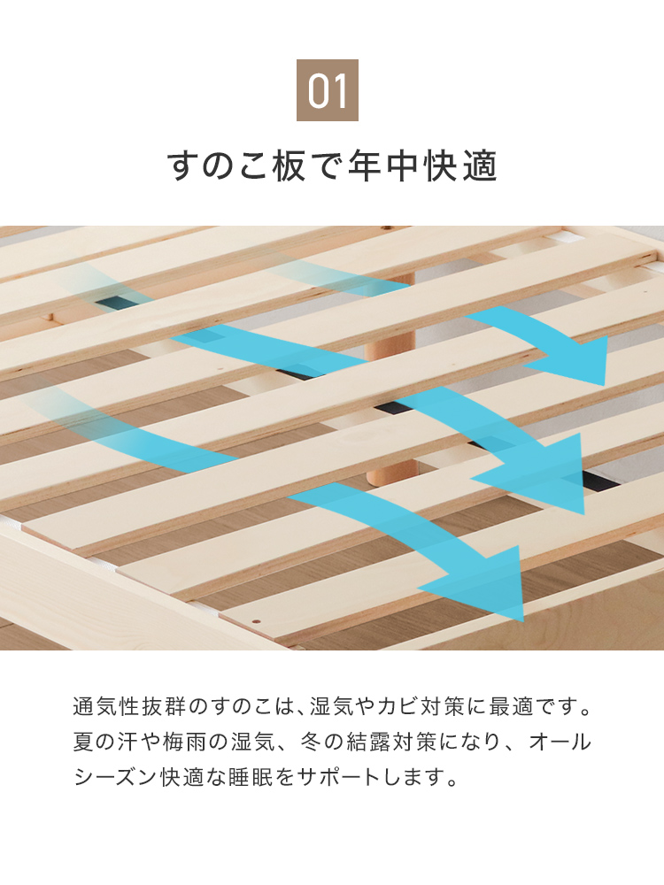 すのこベッドフレームは通気性抜群で年中快適な睡眠を実現します。高耐久天然木使用、マットレス・布団両対応。