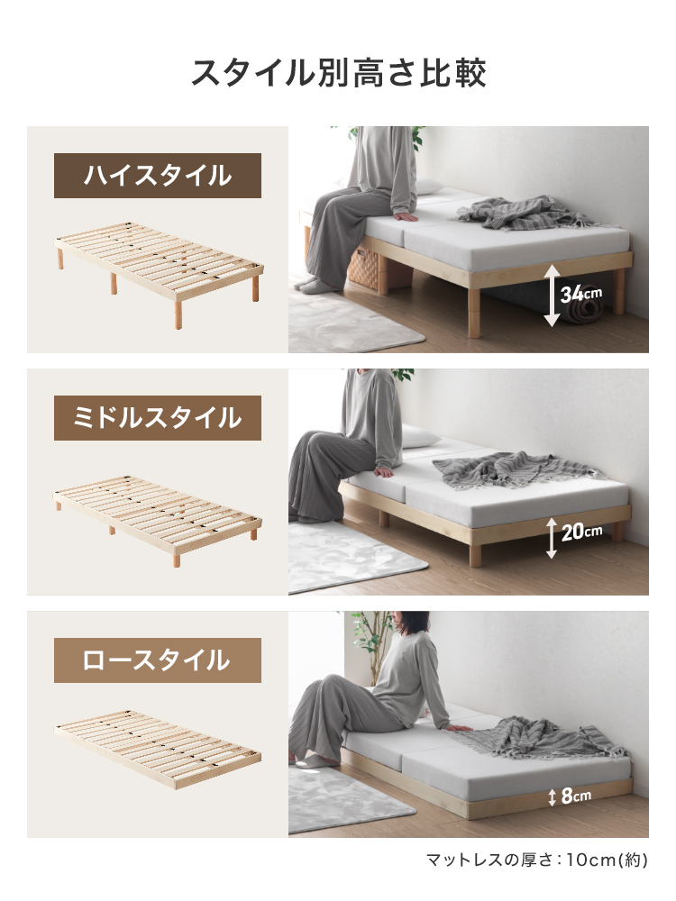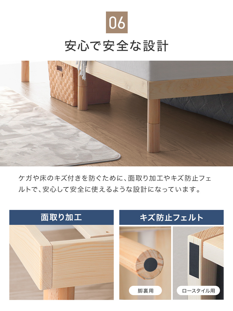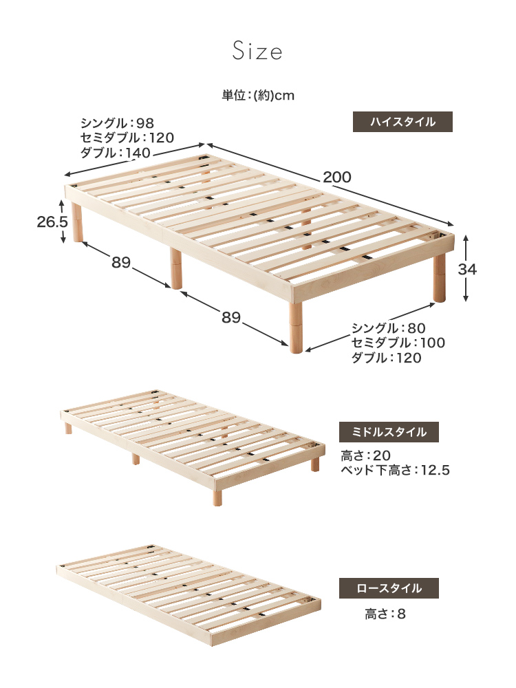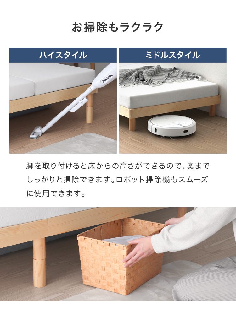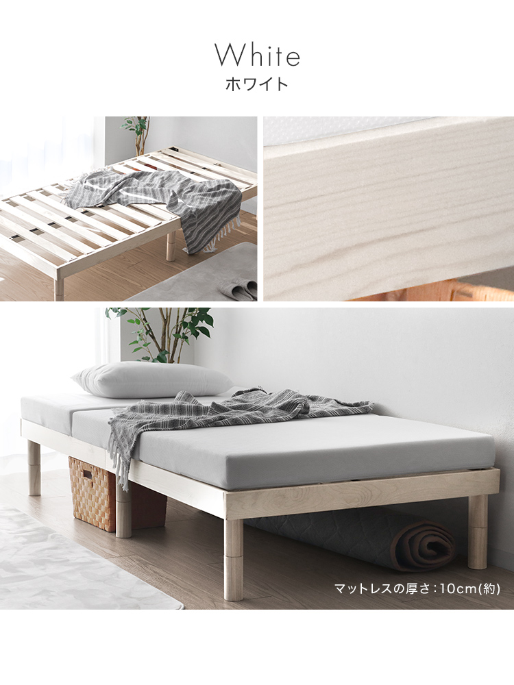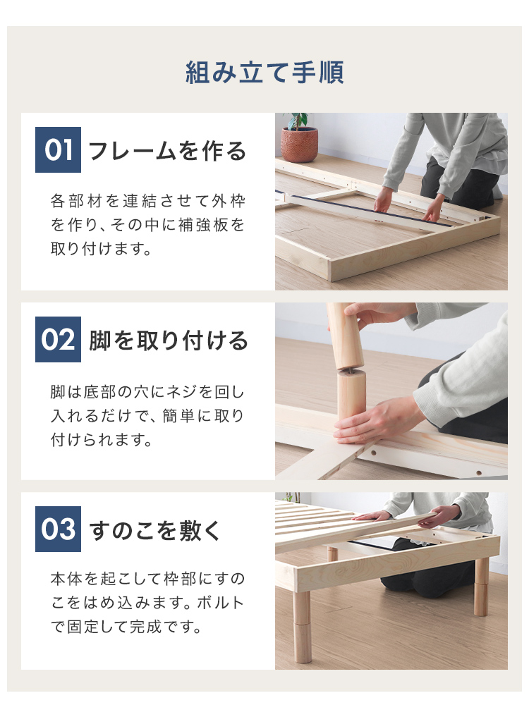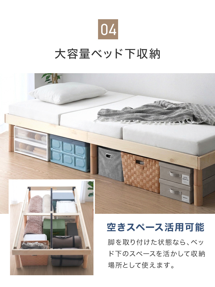 すのこベッドフレームは通気性抜群で年中快適な睡眠を実現します。高耐久天然木使用、マットレス・布団両対応。