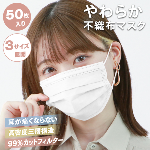 クーポンで1箱251円 不織布マスク やわらかマスク 10枚ずつ個包装 使い捨て 平ゴム 大人 こども 小さめ 99%カットフィルター 白 耳が痛くならない 3層構造