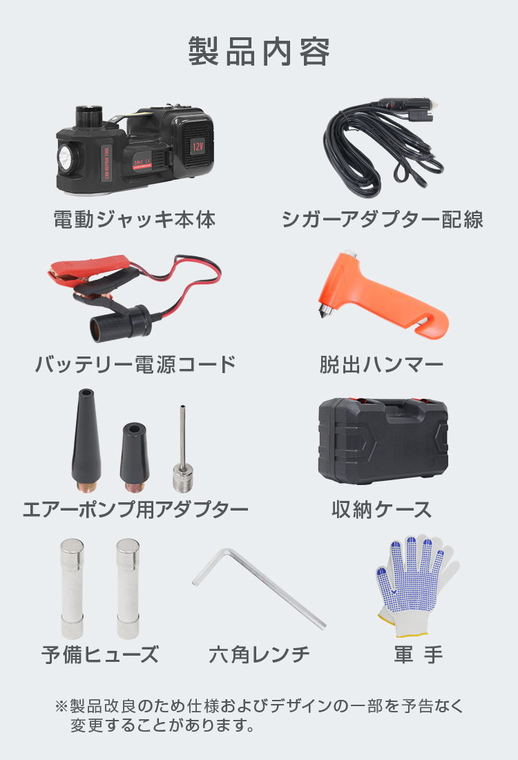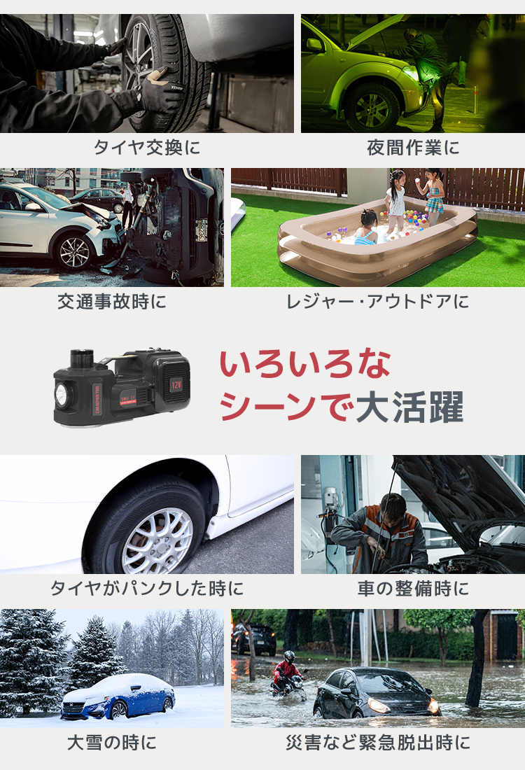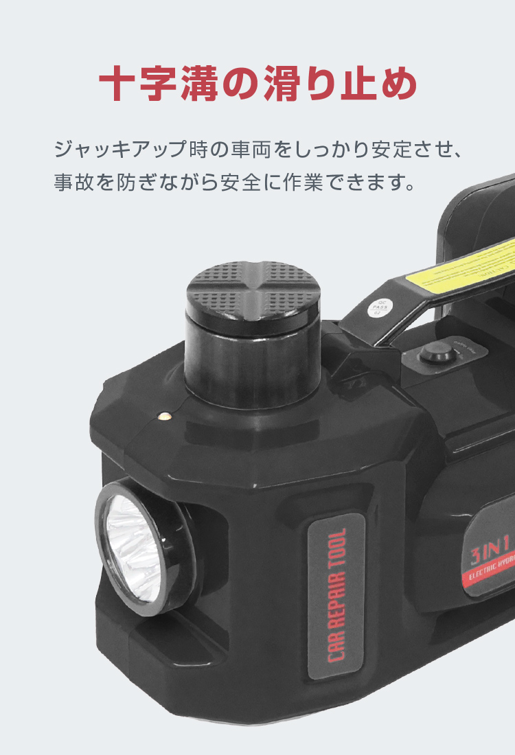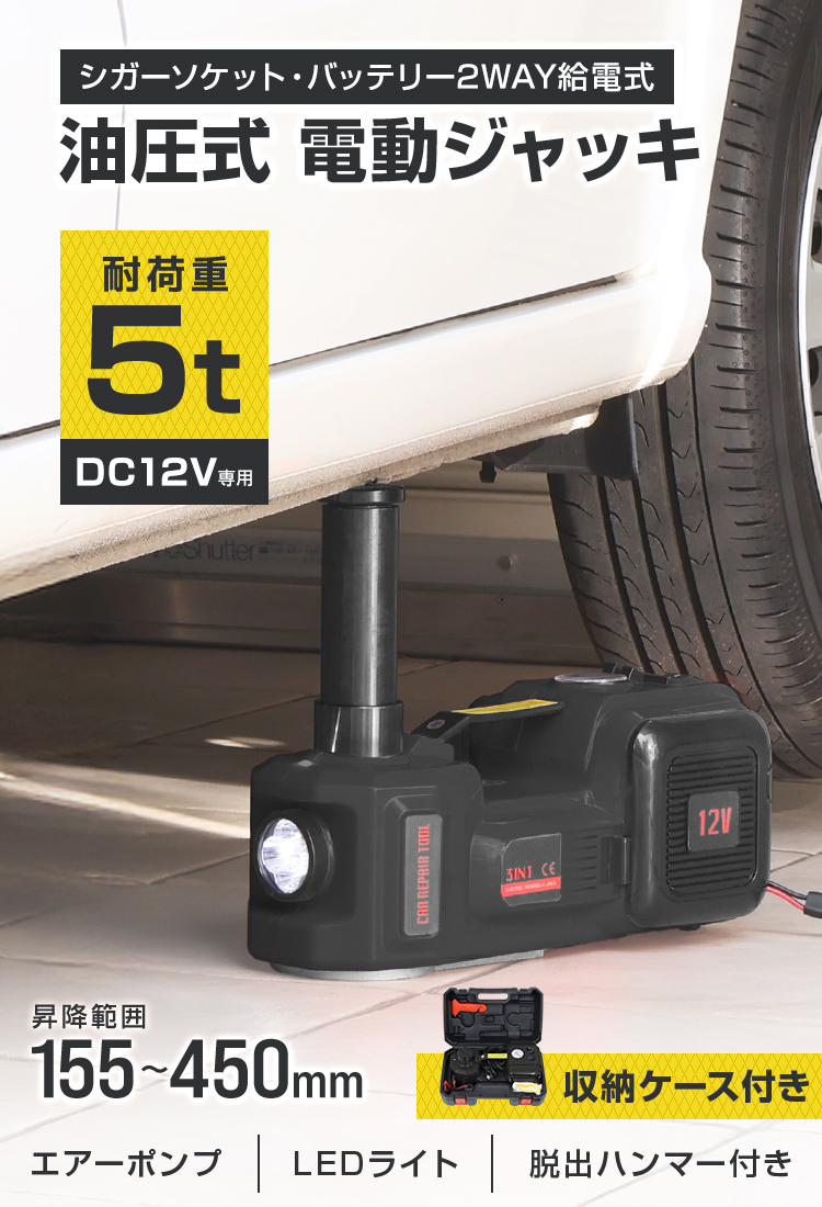 電動油圧ジャッキ 空気入れポンプ 5トン対応 電動ジャッキ DC12V 車載用 タイヤ空気入れ LEDライト付 脱出ハンマー付 コンパクト 軽量