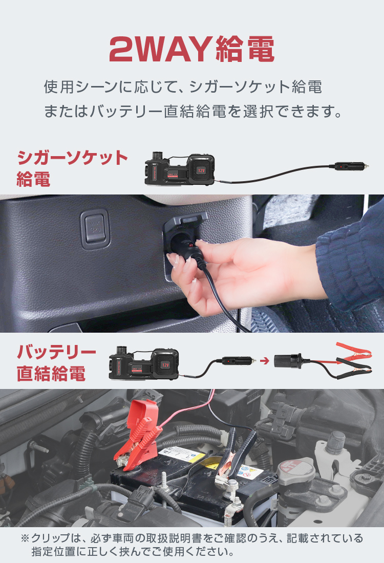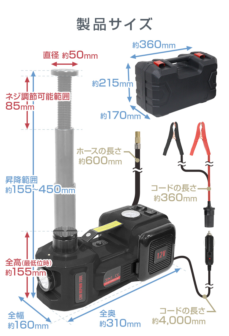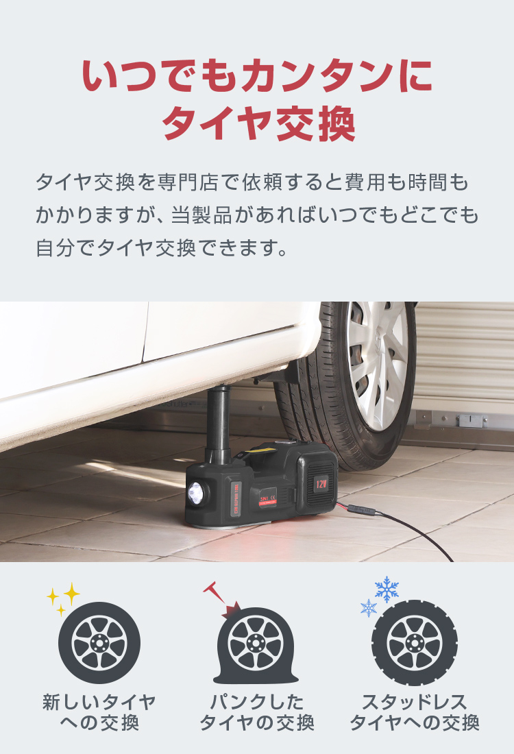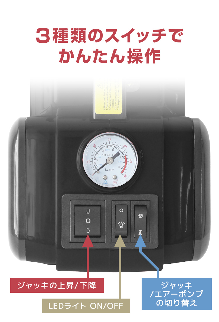 最大5トンまでの車両を135〜450mmの範囲でジャッキアップできる、電動油圧ジャッキ用エアーポンプです。