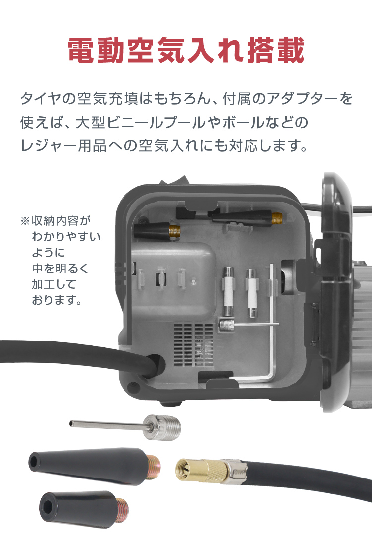 最大150psi対応の電動エアーポンプを内蔵し、タイヤの空気補充にも便利。