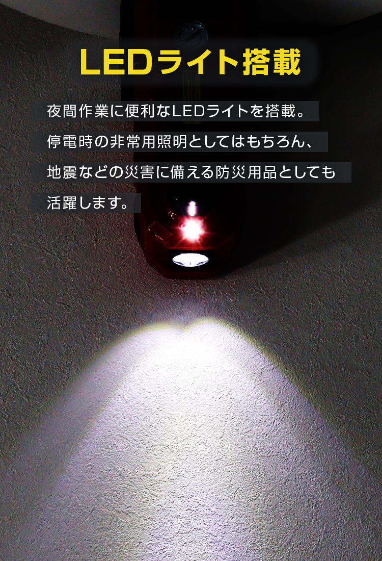 LEDライト搭載で夜間作業も安心です。